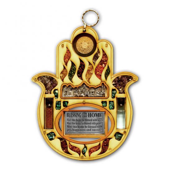 Beautiful, hand made Hamsa with Blessing for the Home. Decorated with semi-precious stones. Contains holy water and holy soil.