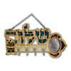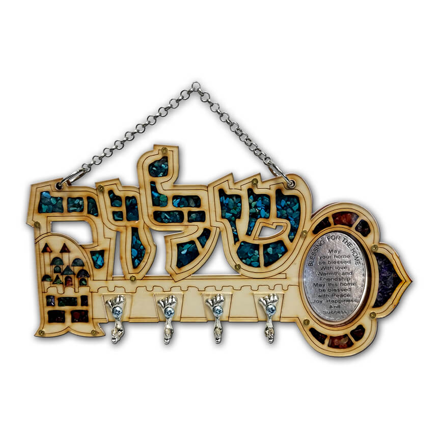 Wall Key Hanger Shalom, hand crafted in Israel. Made of fine wood and decorated with silver and semi-precious stones. Turquoise, cornelite, amethyst. There is an engraving of Blessing for the home, made on a silver plate.