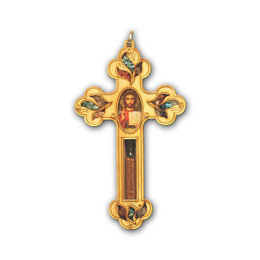 Wooden Cross with Icona and Holy Soil, decorated with amethyst, turquoise and carnellite stones.