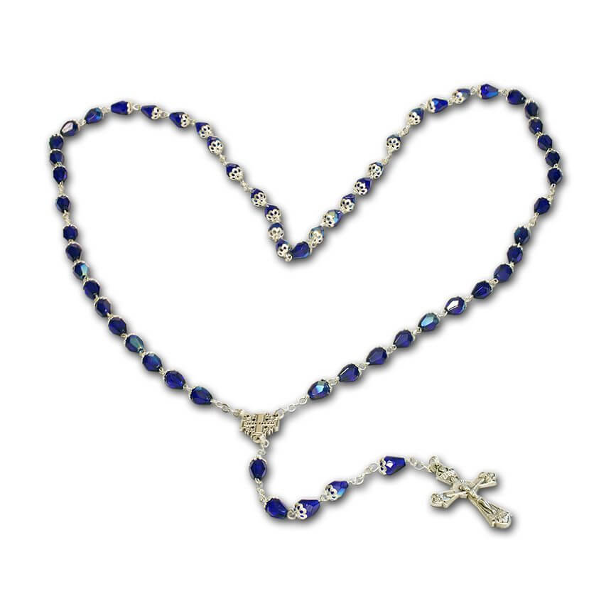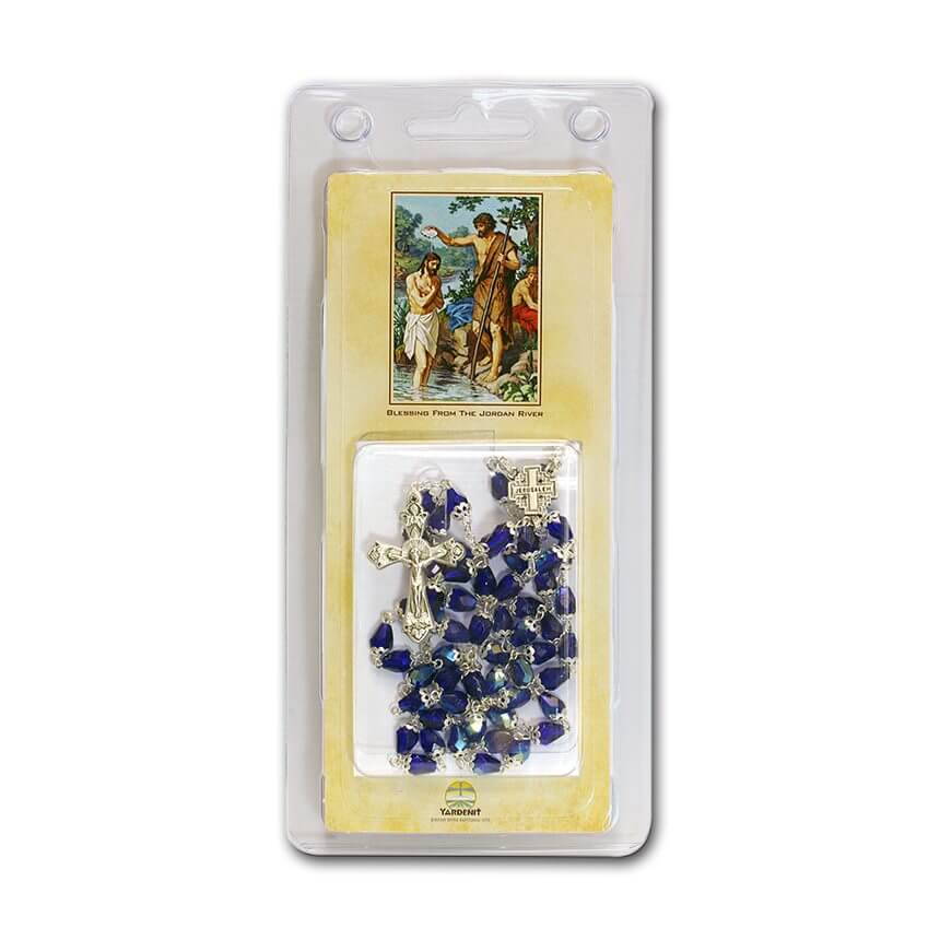Beautiful gift from the Holy Land — Rosary made of dark blue crystals with silver plated chain. This rosary has been blessed and placed in the water from the River Jordan.