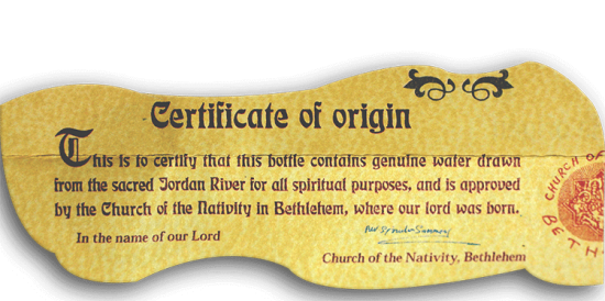 Includes the Certificate from the Church of the Nativity in Bethlehem.  The Holy Jordan Water is suitable for religious purposes. Recommended for Christenings.