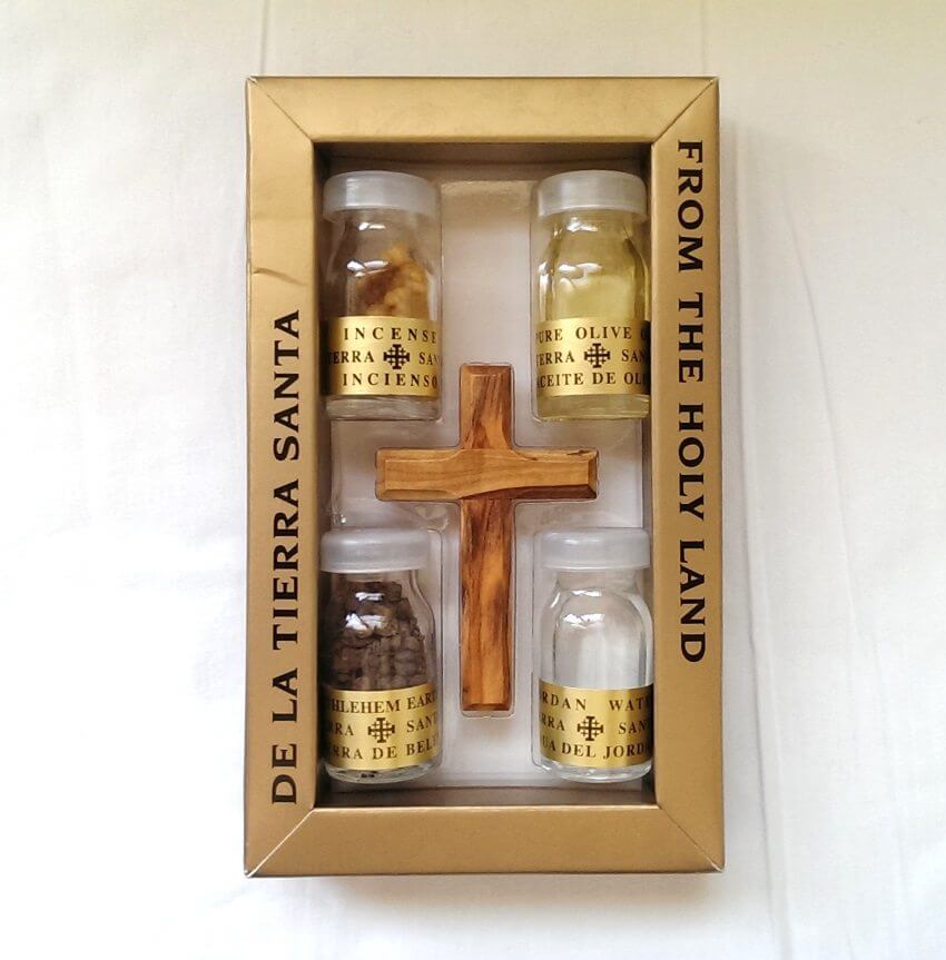 The Cross is made of the best quality Holy Land Olive Wood. The set includes soil from Bethlehem, water from the Jordan River, pure Olive Oil and incense.