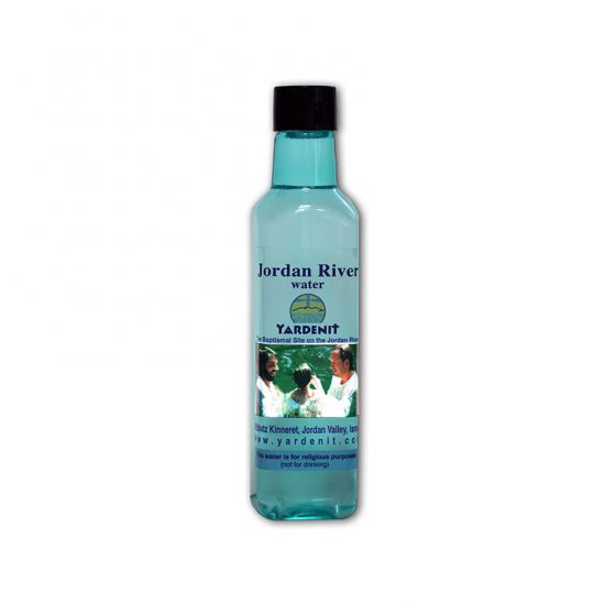 Holy water of the Jordan River in a beautiful blue bottle from Yardenit the baptismal  site.