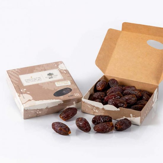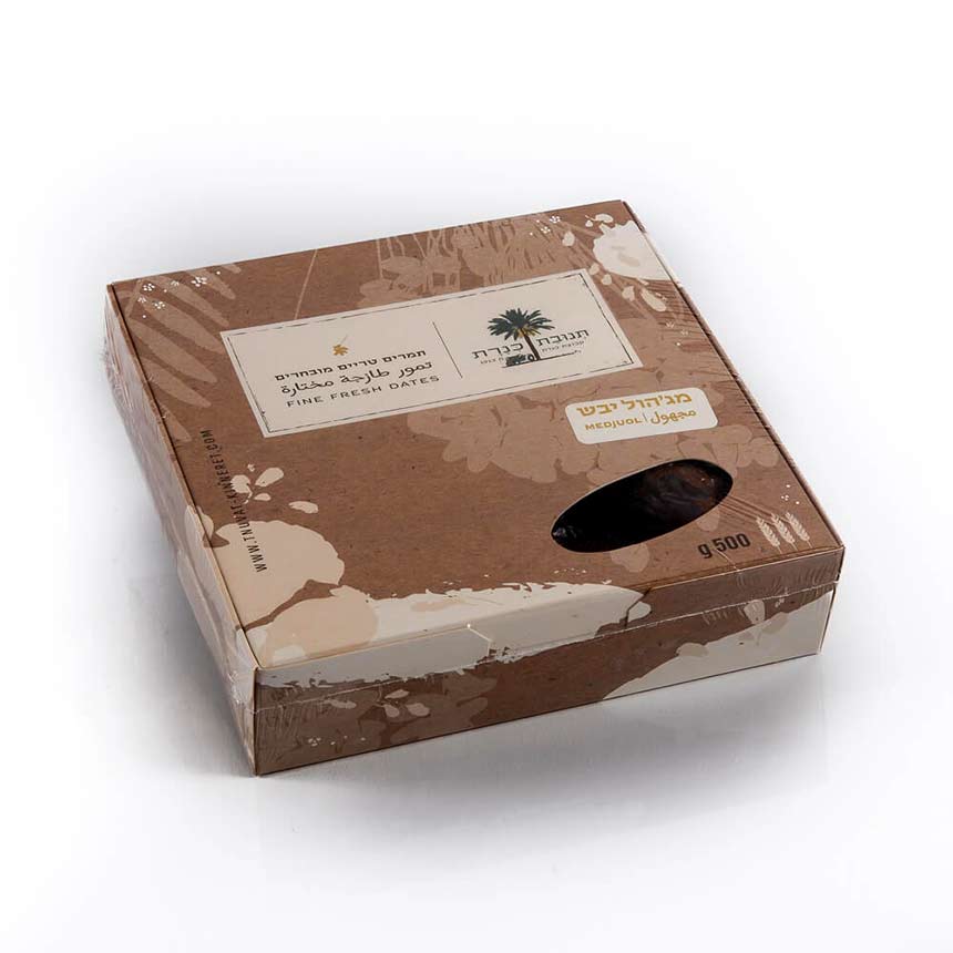 A box of 1 LB. (0.5 kg) Medjool dates, which are large and literally melt in your mouth.