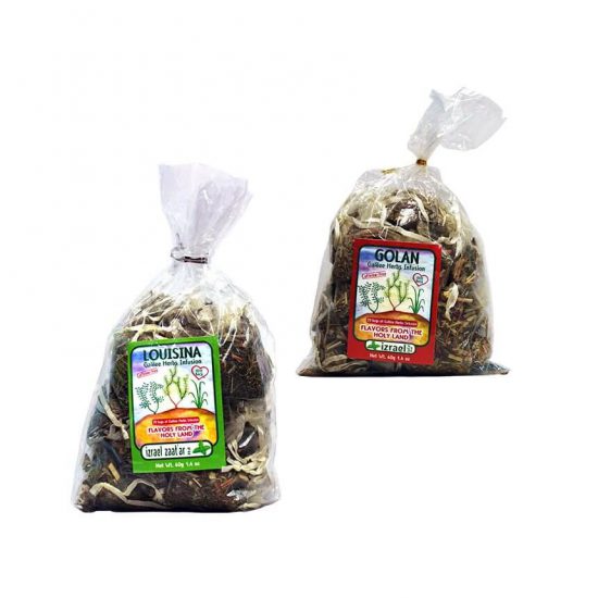 Golan ingredients: Nana (Mint), Sweet Marjoram, Lemon Grass, White leafed Savory, Salvia (Maramia), Rose leaves. Great for relaxation.