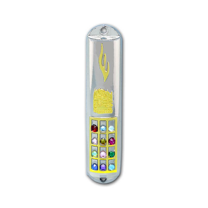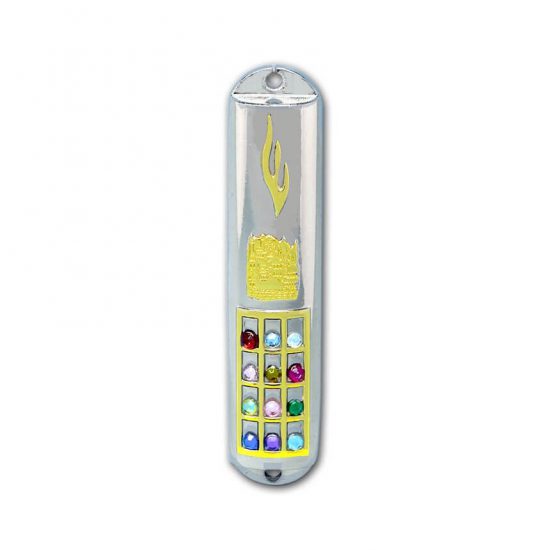Jerusalem and Hoshen Mezuzah. Nickel plated, decorated with colorful crystals.
