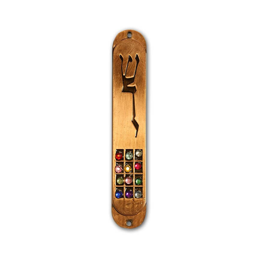 Shaddai and Hoshen Brass Mezuzah. Decorated with colorful stones.