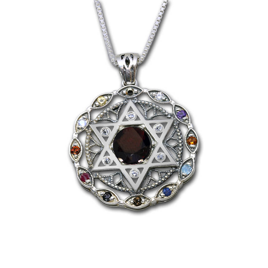 Star of David with Hoshen stones. Sterling silver pendant, set with 12 semi-precious and precious stones.