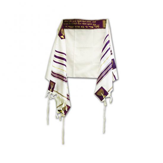 100% Acrylic Tallit. Decorated with the Menorah Symbol on all four corners  and has following Biblical verse: