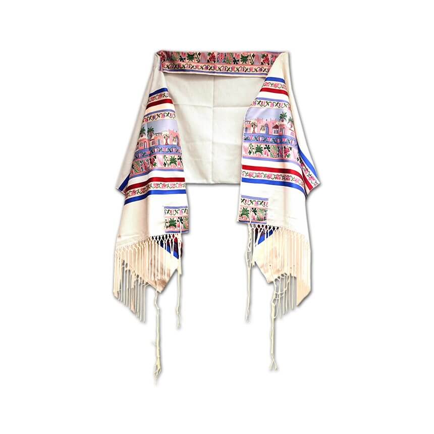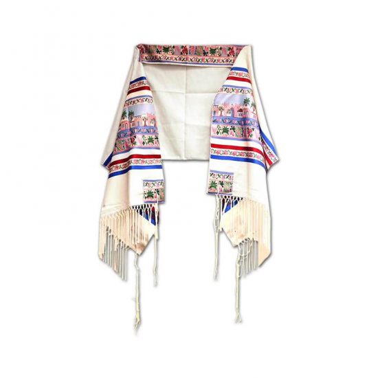 Seven species tallit is decorated with images of the Seven Species that were mentioned in the Bible.