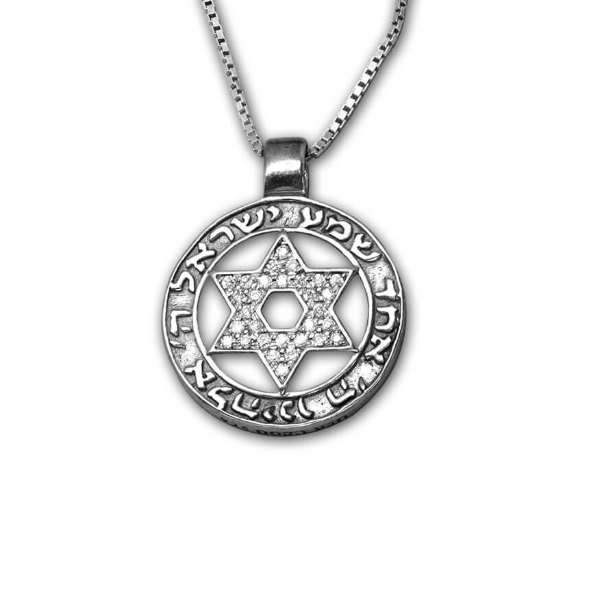 Shema Israel Star of David necklace made of sterling silver and set with zircons.