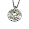 Round pendant with words from the Bible with a golden heart in the center.