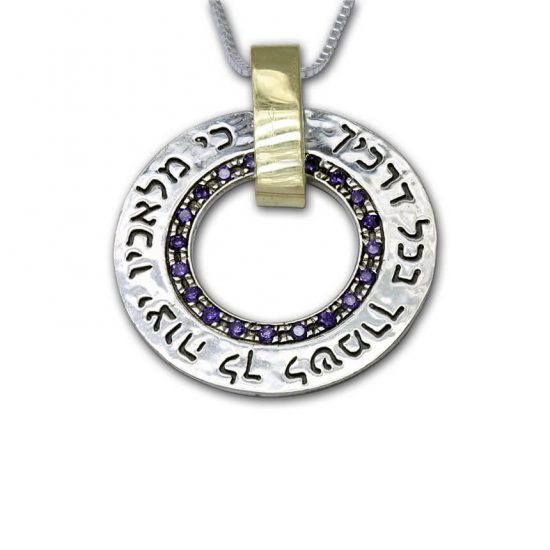 Hand made in Israel Guardian Angels Silver and Gold Necklace. Set with amethyst stones.