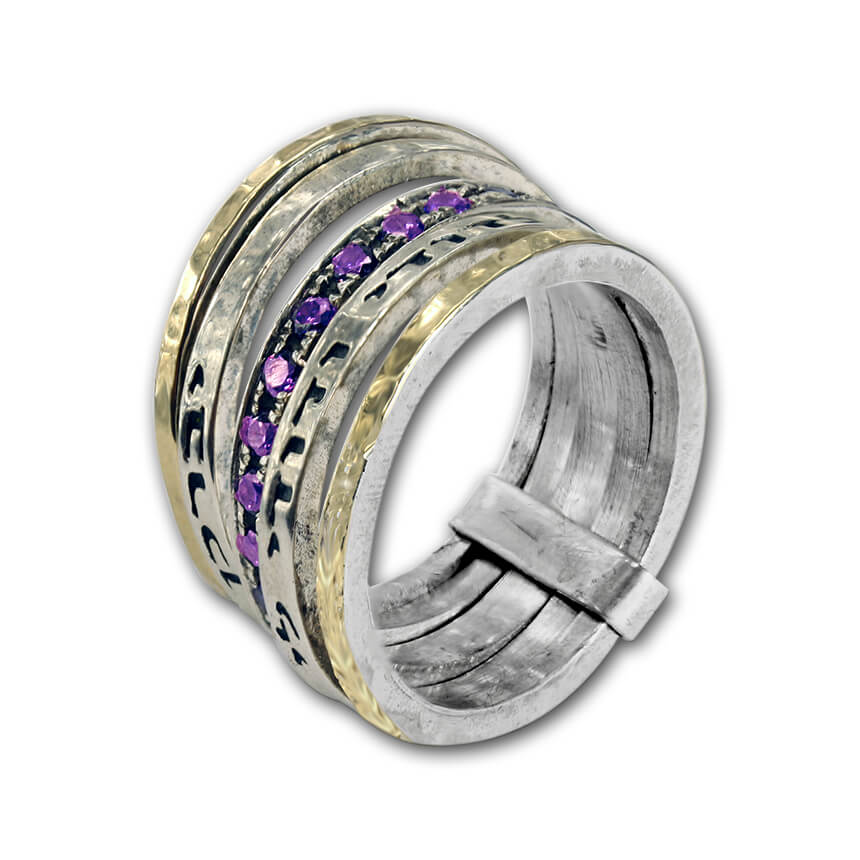 Multi Ring with Two Blessings and Amethyst Stones. Two 9 kt gold rings and three sterling silver rings with engravings in Hebrew.