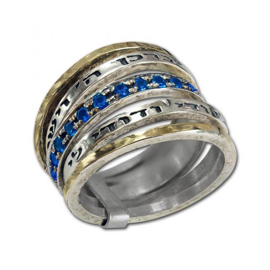 Multi Ring with Two Blessings and Sapphire Stones. Two 9 kt gold rings and three sterling silver rings with engravings in Hebrew.