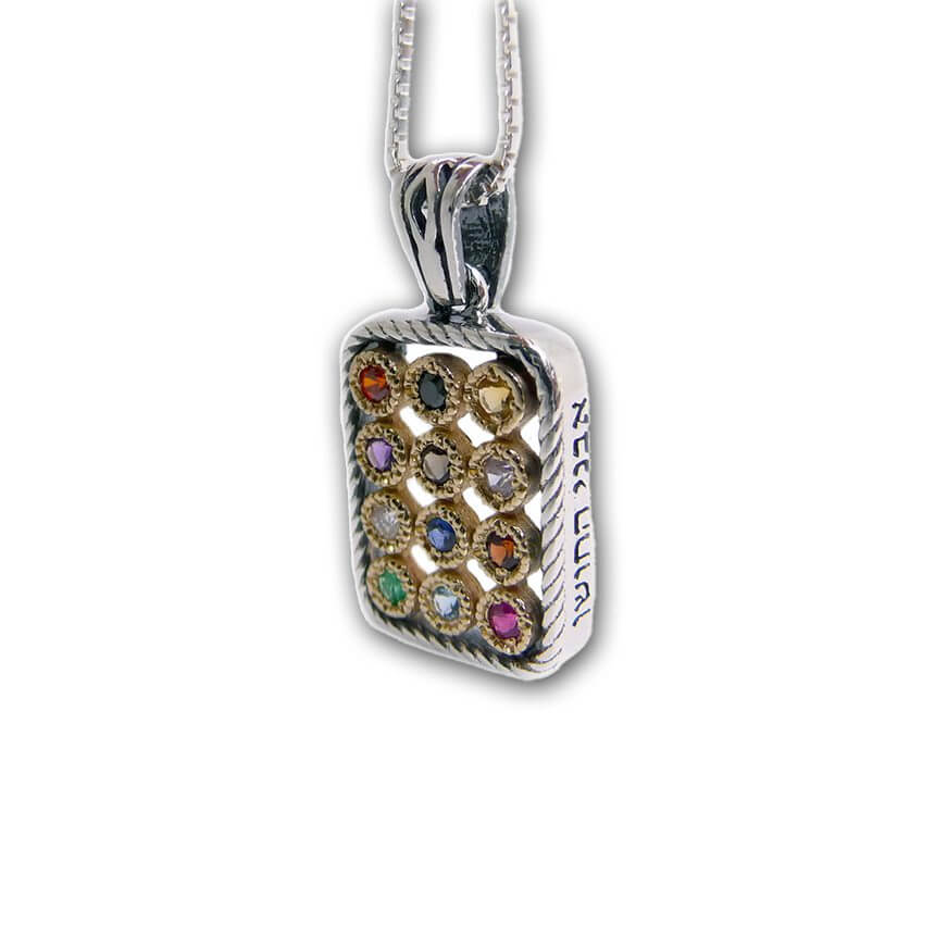Hand made of sterling silver and gold Hoshen pendant is set with 12 genuine stones which symbolize 12 Tribes of Israel.