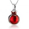 A beautiful and symbolic Pendant made from polished silver with red enamel in the shape of a pomegranate. Several red Garnet stones are embedded in the center as the pomegranate “seeds.” This breathtaking silver red enamel Pomegranate Pendant is a stunning piece of jewelry that will make a perfect gift for your loved one. The pomegranate is one of the seven species, the seven special fruits of Israel, showing the blessing and bountifulness that G-d bestows upon the Holy Land. Red Garnet stones are set clustered in the center of the pendant, resembling the pomegranate seeds themselves, and adding a beautiful color contrast to this already captivating red enamel pendant.