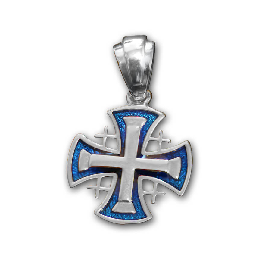 Silver with Blue Enamel Jerusalem Cross. This delicate and elegant pendant is a wonderful gift for any believer.