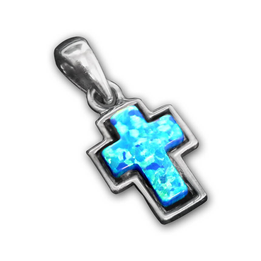 Small Silver with Opal Cross. Miniature silver cross set with man-made opal stone. Made in Israel.