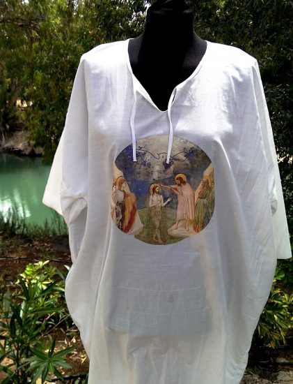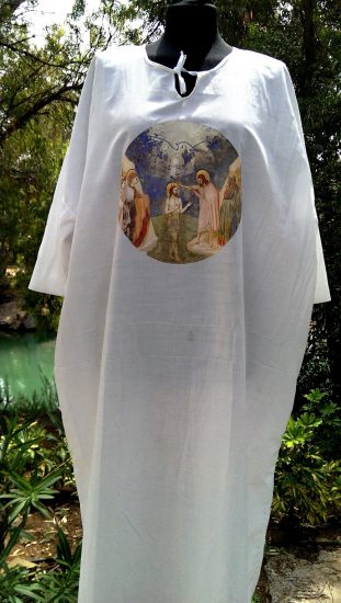 Yardenit  Baptismal Gown — white gown with printed picture of John the Baptist baptizing Jesus Christ .