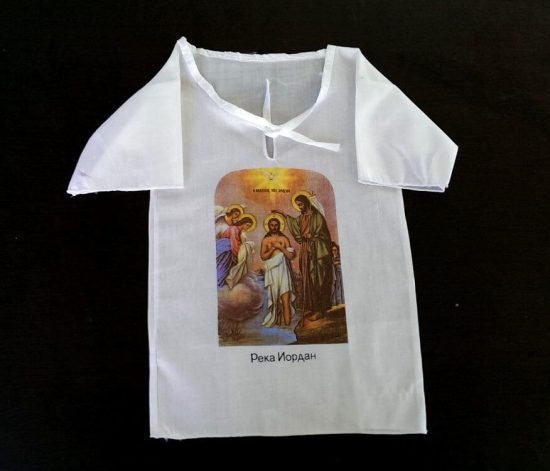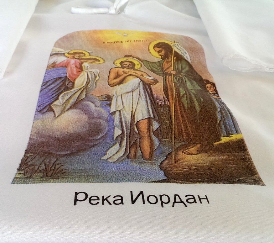 Yardenit  Baptismal Gown — white gown with printed picture of John the Baptist baptizing Jesus Christ . With writing in Russian: Река Иордан.(The Jordan River).